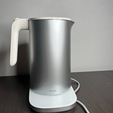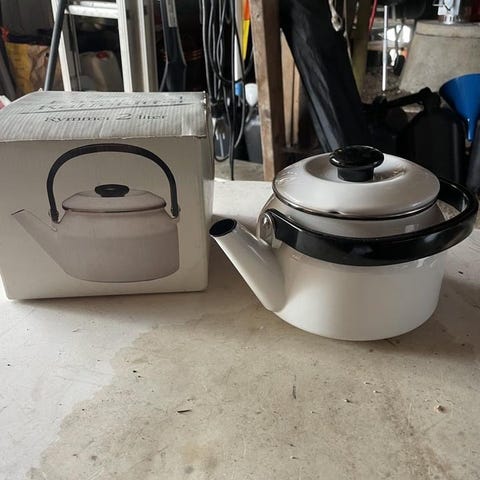 En blå kaffekittel från Kockums. Den rymmer 4 liter och har en diameter på 22 cm.