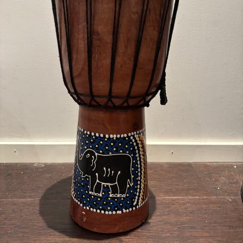 Äkta afrikansk trumma. Inköpt i Kongo på 60-talet. Ej turist souvenir. Höjd 68cm diameter 25cm.