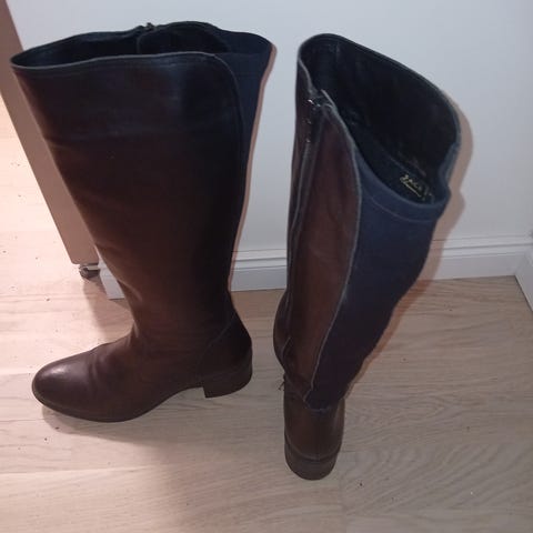 Svart skinn, med dekorativt band och spänne över vristen. Skaftet har en elastisk bit med resår som reglerar vidden över vaden.