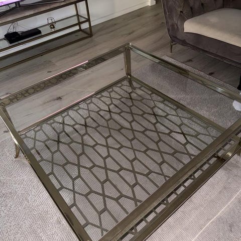 Soffbord i mässing med rökfärgat glas i måtten 134X70X45. Går att putsa upp för att få det klart. 2000kr