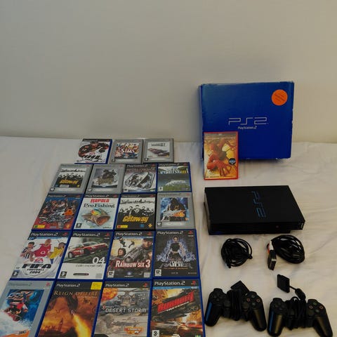 PS2 säljes med 3 spel och två kontroller. Plus fjärrkontroll ps2.