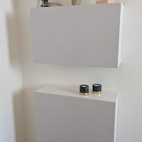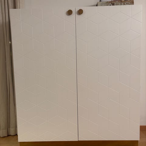 Vitt väggmonterat skåp från IKEA:s BESTÅ-serie med mönstrad lucka från Superfront i ljusgrått. Skåpet är i mycket fint skick och mäter 60x22x38 cm.