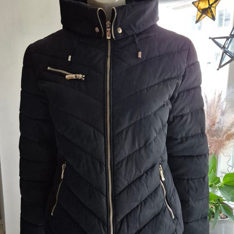 A stylish long winter coat with gold zipper and removable faux fur hood – ideal for cold days with conscious elegance.