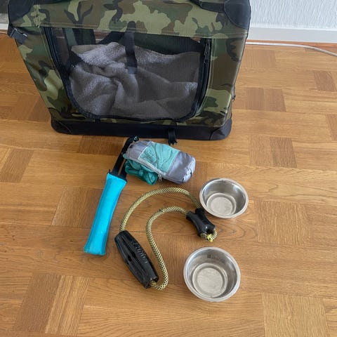 Hundtillbehör set bestående av en fyrkantig hundkudde i rött, två rostfria matskålar på blå matta med benmotiv, en svart filt samt en blå och vit väska med benmotiv. Passar för hund vid vila, utfodring och transport av tillbehör.