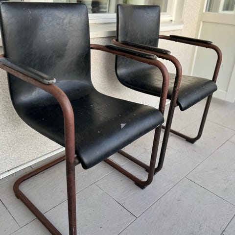 1930-tals stålrörsfåtölj i krom och svart skinn, troligen omklädd till skinn då dessa fåtöljer som var vanliga i väntrum på tandläkarmottagningar och kontor nästan uteslutande kläddes med pergamoid, föregångaren till konstläder av pvc.
