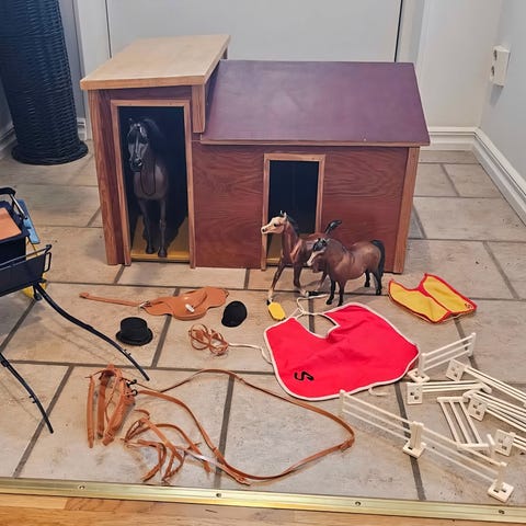 Stall med hästar och tillbehör