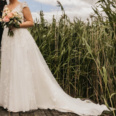 Jag köpte klänningen (figursydd enligt mina mått) och slöjan helt nya från Ivory & Grace 2025 och dem är därmed bara använda vid ett (mitt) bröllop.