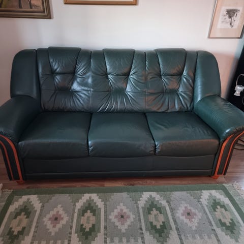 Svart skinnsoffa från 60-talet, resårbotten, helt ok skick för sin ålder. En dyna har ett trasigt blixtlås, går dock att använda ändå. Träben. Snygg retrosoffa med viss patina. Den är 185 cm bred och ca 73 cm hög i ryggstödet.