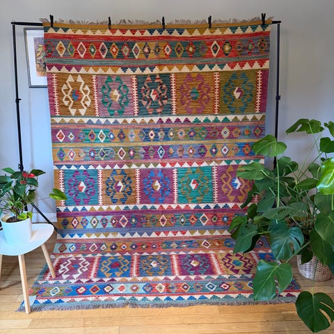 Vacker handvävd Kelim-matta tillverkad av 100% ull i multi färger, mått 240 x 178 cm. Mattorna tillverkas med traditionell kelimteknik. Hantverksmässigt vävd av Turkmener i norra Afghanistan.