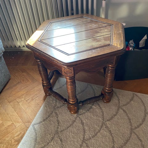 Charmigt vintage sexkantigt sidobord i mörk valnöt