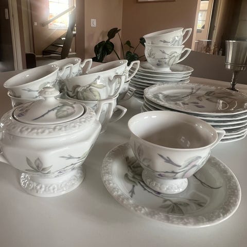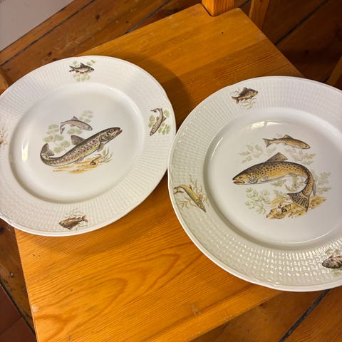 12 st har en diameter på 20,5 cm och den stora har en diameter på 33,5 cm. Alla är målade av Anita Friberg på Rosenthal porslin