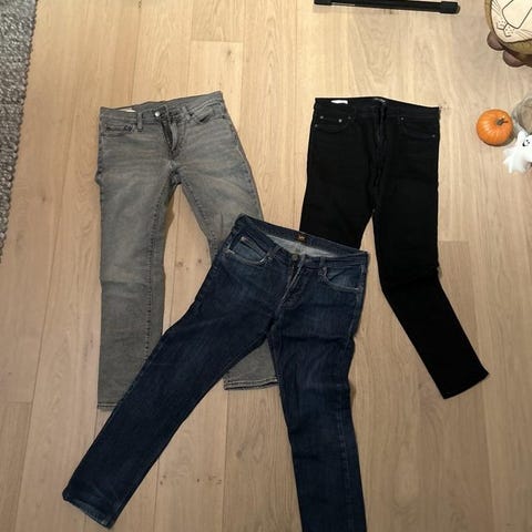 Två par Gant jeans stl 176 o 170, två par skinny jeans blå o grå stl 164, ett par mörkgrå Ossoami jeans stl 158