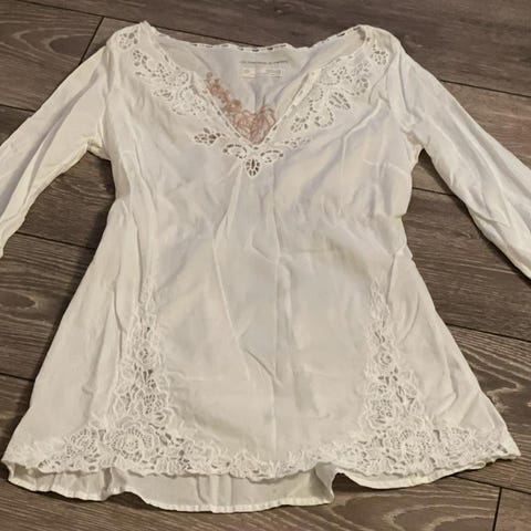 Ny Vit blus med blått mönster och broderier. Blusen har en v-ringning med spetskant och korta ärmar.