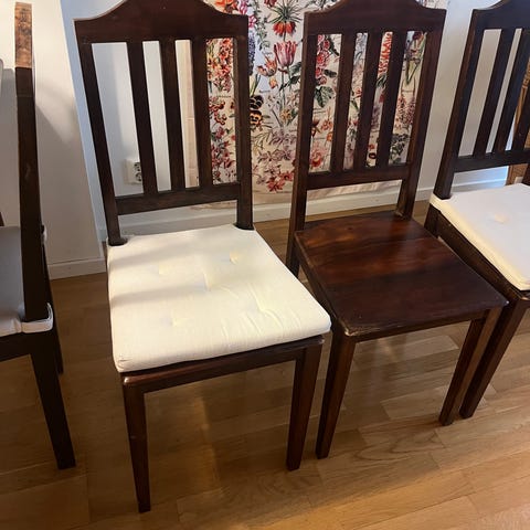 6 st klädda stolar, avtagbar klädsel, lite söndrigt i en söm. Säljes alla tillsammans 250kr/st