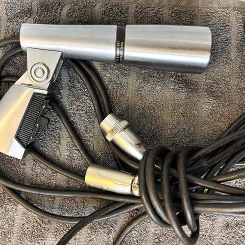 Stereo Par Shure Prologue 16L kondensatormikrofoner ca 1980. Fantastiska mikrofoner för ride och high-hat och annan percussion (speciellt bongos). Väldigt krispigt ljud och tar upp höga frekvenser väldigt snyggt. Mycket mikrofon för pengarna!