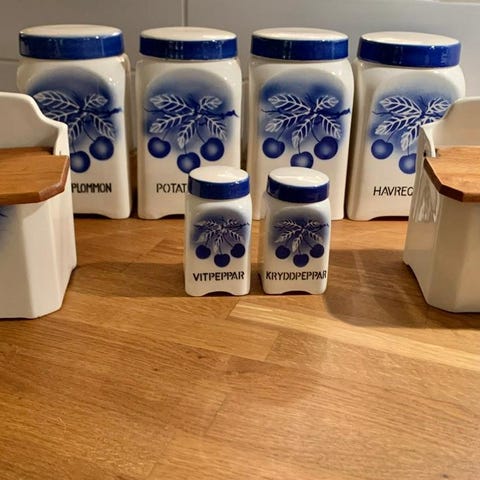 Kryddburk Nejlikor svenskt porslin Svaneholm 1530, Fyrklövern. Burken är ca 10,5 cm hög med locket på och ca 8,5 cm utan lock. Diametern upptill är ca 5,5 cm. Plastpackningen på locket har gulnat. Burken har en svart prick på baksidan, se sista bilden. I övrigt är burken hel och fin utan sprickor eller kantstötningar. Vill du fler bilder hör bara av dig så löser jag det. Jag har ytterligare tre kryddburkar som jag kan starta upp annonser på om intresse finns, Kardemumma, vitpeppar och kummin. Hör av dig om du är intresserad av fler burkar. Tar gärna fler bilder om du vill.