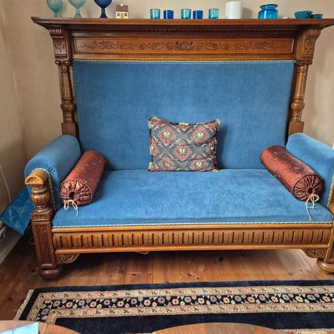 Soffa av äldre modell med bäddfunktion bortskänkes mot avhämtning. Höjd 148, längd 190, djup 80.