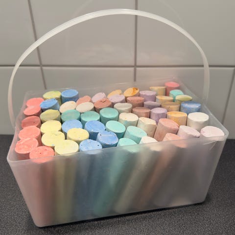 Formad som en fjäril är kritorna som ligger i sin förpackning. Bar present till de mindre barnen. Här kan man rita roliga saker på asfalten t ex. Total höjd och bredd 12,5 cm. Kan hämtas på Fridhemsgatan vid Fridhemsplan.