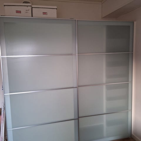 Två dörrar och två lådor, klädstång upptill och ett hyllplan bakom dörrarna. Utanpåliggande gångjärn och handtag i silversvart metall, magnetlås på dörrarna. Stor garderob för den som behöver mycket förvaring av kläder, skor och andra saker.