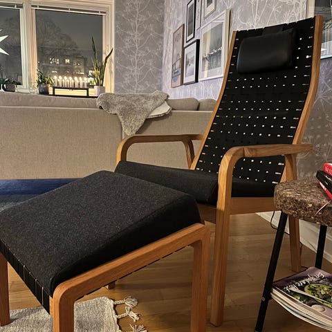 Har två stycken helt nya Little Petra fåtöljer i fårskinn moonlight.