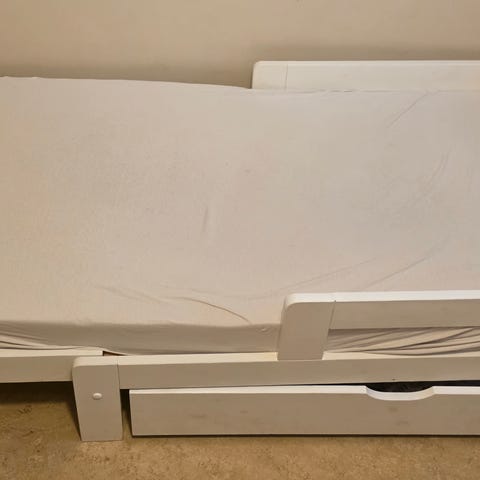 Vit växasäng från IKEA, modell Sundvik, sparsamt använd inklusive ribbotten och fläckfri 10 cm tjock skummadrass i två delar som kan förlängas från 130 cm till 165 cm.