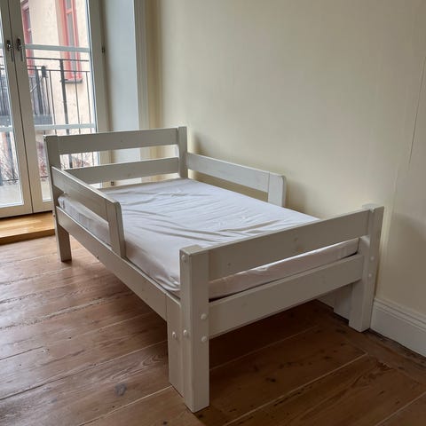 Sängen kan förlängas till totalt 200 cm och har en bredd på 80 cm madrassbredd. Sängens yttermått mäter ca 90 cm.