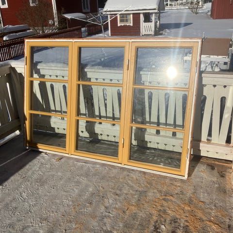 Dubbelglas isloerad. Mått: 230 x 118 cm. Blivit över efter renovering. Öppnas utåt,
