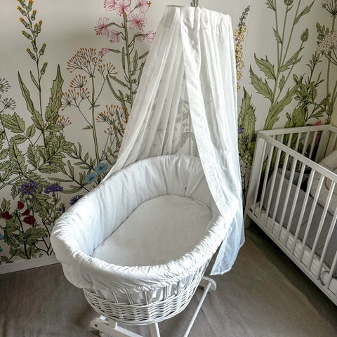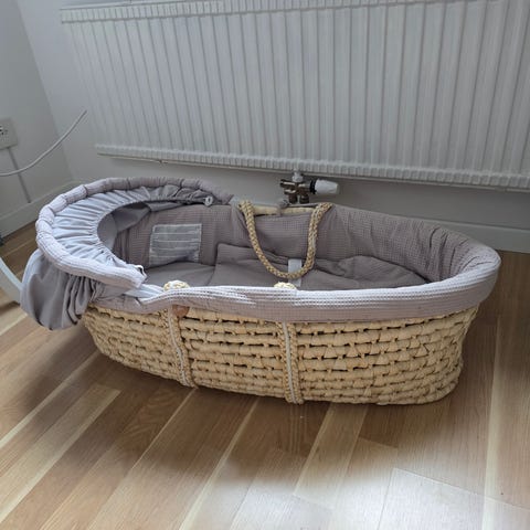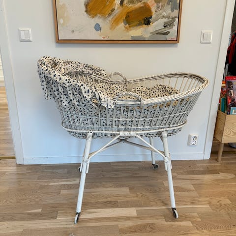 Handvävd moseskorg i bästa kvalitet från danska Efia. Den är robust och tålig och har höga kanter (jag använde stora handdukar under madrassen för att höja sovnivån). Luksus för bebisen!