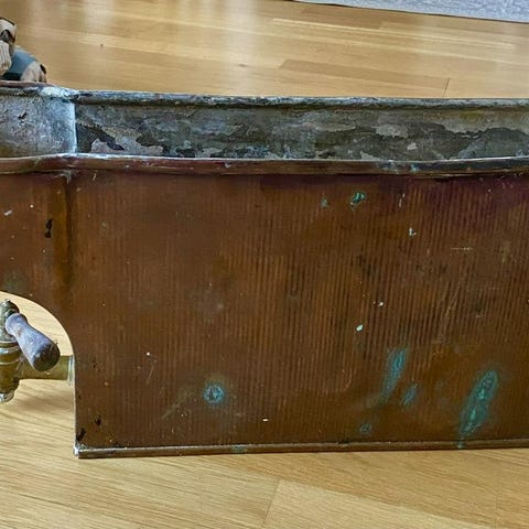 Redahylla av okänt fabrikat enligt mig. Skeppet i glas, dock saknas det 2 st stora skeppor. 4 av de stora skepporna har nagg i hörnorna. Måtten på hyllan är 46*31,5*13,5cm