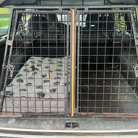 Jeppe dubbelbur för Volvo 855/V70 -2008. Mellanvägg, lås för grindar och krok för baklucka medföljer.
