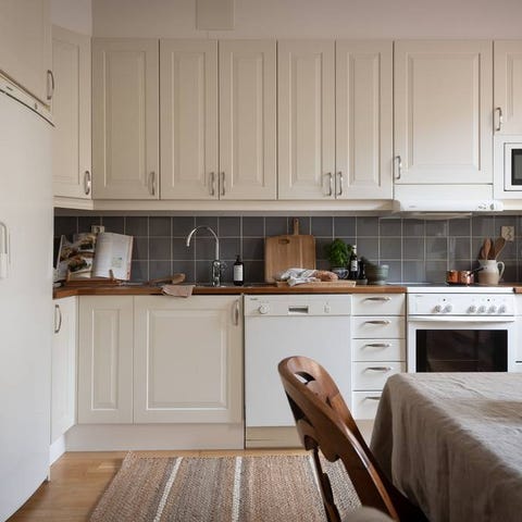 Köket är i mycket gott skick för sin ålder. Vissa luckor och handtag har normalt bruksslitage. Luckorna vid vasken är något slitna i överkant, men slitaget är enbart kosmetiskt och helhetsintrycket är fortsatt fräscht. (Se bild). Köket är omlackerat från trä till vitt. Vissa täckskivor och skåpsidor är endast målade på de ytor som varit synliga i nuvarande layout. Vid samma typ av montering syns detta inte alls. Om man däremot vill placera något av dessa skåp fristående kan sidorna enkelt målas eller kompletteras med en ny täckskiva.