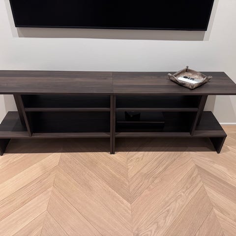 Hyllan är tillverkad av lackerad rökt ek. Dörren/luckan är klädd med mesh-tyg, så att det går att gömma dosor snyggt samtidigt som fjärrkontrollen fungerar optimalt.