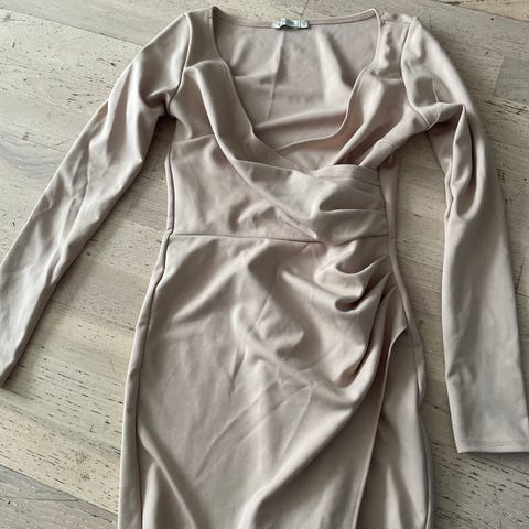 Glittrig guldiga långklänning från NLY One med asymmetrisk nederkant och rynkade detaljer framtill. Klänningen har lång ärm, v-ringning och figurnära passform. Perfekt för nyår eller fint festkan möta er i Stockholm city utanför Åhléns