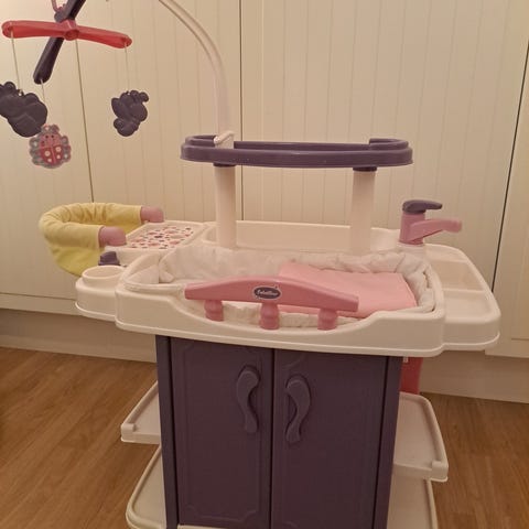 Säljer ett skötbord för dockor. Det är lekt med. Pris 100kr Är nedpackat så kan skickas.