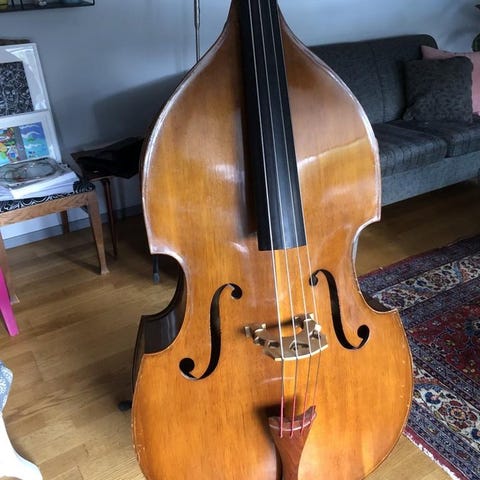 Dödsbo säljer en mycket fin tysk fyrsträngad kontrabas från ca 1900. Modell Gamba med välvd botten. Locket: medium till bredådrig gran Botten/sargen/snäckan: mycket fin bred flammig lönn Längd locket: 108 cm Bredd ovan/mitten/under: 52 cm / 39,5 cm / 70 cm Djup sargen: 19 / 21,5 cm Fodral ingår. Mycket goda referenser finnes.