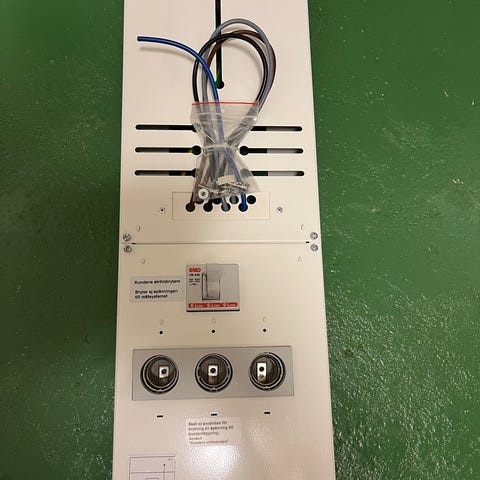 Färdigbyggd elcental i plåt från märket Garo, inkluderat: huvudbrytare, jordfelsbrytare, säkringar fasskena...