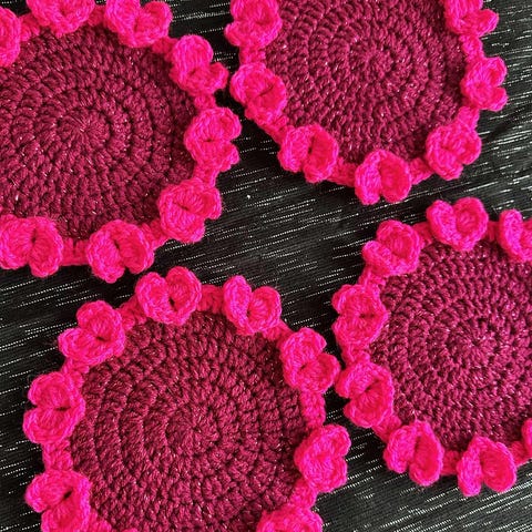 Färgglada handvirkade grytlappar i 100% bomull.
