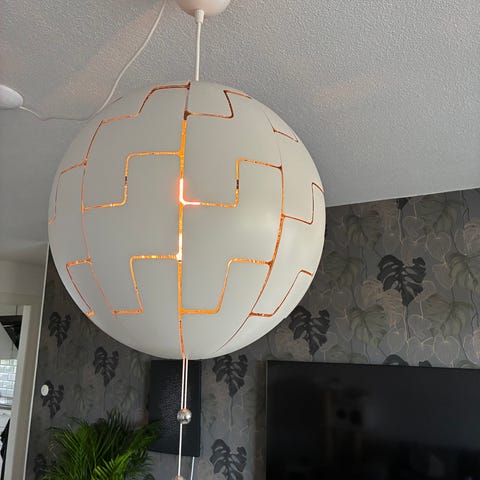 Lampa med stor porslinsglob 95 cm i omkrets Har en svart fläck som kan gå skrubba bort. Klistermärkena går ta bort