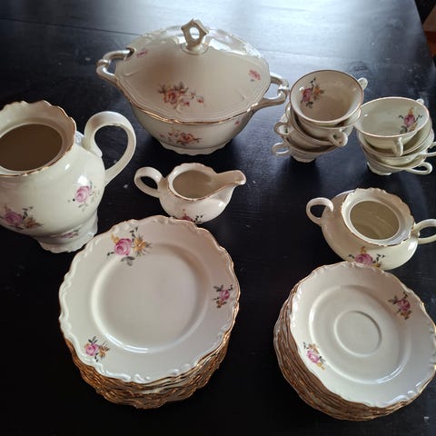Mat Service porslin ( Viktoria) 2 st Oval djup tallrikar 36x22 cm, 1 st stor Oval gryta med lock, 1 st skål sås.