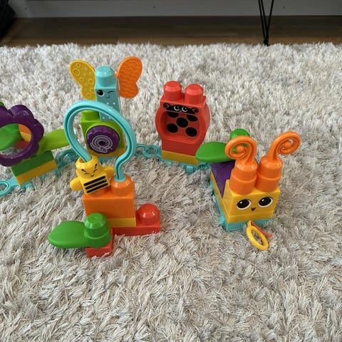 Mega blocks vagn som barnet kan dra efter sig, och lägga leksaker i. Flera blocks samt en gubbe ingår.