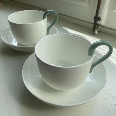 Två tekoppar där du ställer respektive tekanna ovanpå koppen. När du serverar.
