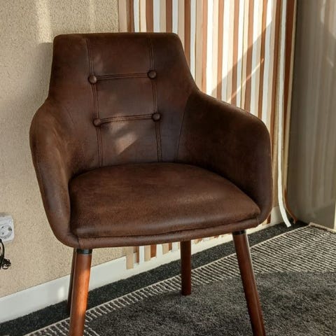 Fåtöljen är i gott skick bortsett från det märke som syns på armstödet och sittdynans kant på tredje bilden.