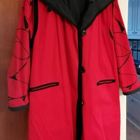 Mörkröd damkappa i 80% ull och 20 % polyester. Innefoder i polyester en innerficka 2st ytterfickor. Inbygd extra krage i halsen. 95cm lång. Storlek 10 eller 36/38. Både dragkjedja och knappar Fint skick.