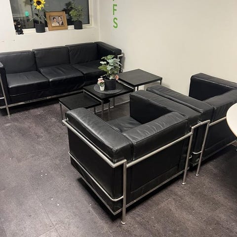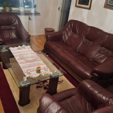 Soffa 3 + 2. Skinn, finns några fläckar men går säkert att behandla skinnet så det blir bättre. 1000kr Gratis om man bär upp dom från källaren…. ;-)
