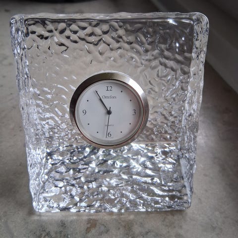 Klocka i Ekebergsmarmor. Höjd 22cm, bredd 17,5cm, djup 6,5cm. Rejäl klocka som väger 6kg. Fungerar, drivs med 1st C batteri.