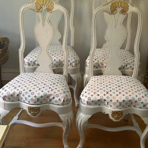 Gruppen består av 6 st. stolar "Barock" (art.nr. 7000), 2 st. karmstolar "Barock" (art.nr. 7001) samt 1 st. matbord m. 3 st iläggsskivor "Barock" (art.nr. 8303 och 8305). Stolarna klädda i samma stilriktiga tyg och försedda med skyddsöverdrag. Alla delar fläck- och skadefria.