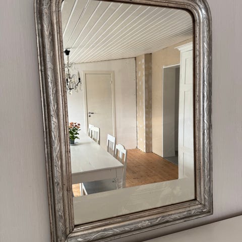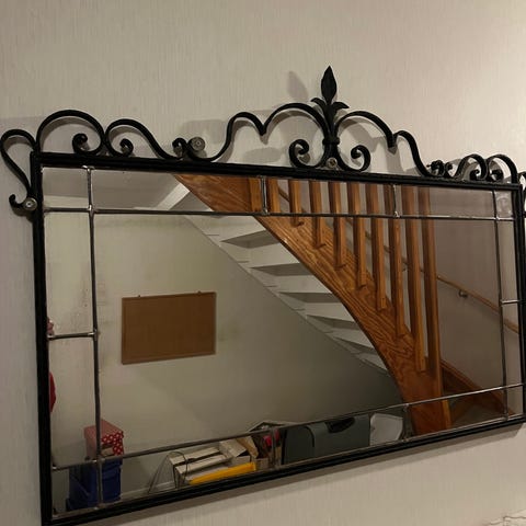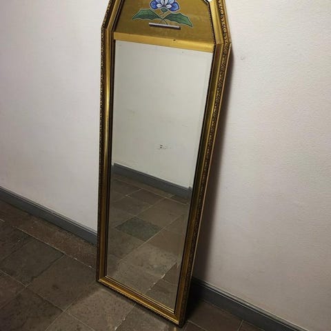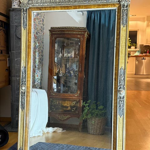 Här har ni en riktigt mäktig spegel som förgyller hemmet. Den är i massivt trä och spegelglaset har blivit utbytt till ett fasat glas under årens lopp.