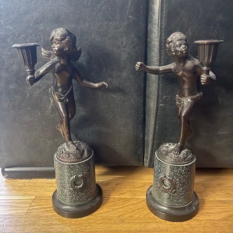Den statyn som är till vänster (med vit) så fungerar lampan. den andra så behövs lampan bytas annars fungerar båda. om ni går in på min profil så är dessa lampor ett par av ett sett. ett till par statyer samt piedestaler. om ni finner det intressant så kan vi komma överens om ett packet pris.