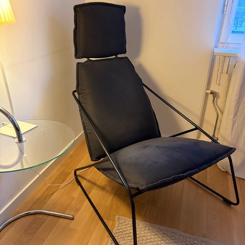 1 st supercool fåtölj i svartlackerad metall, 80 eller 90-tal. Bra skick. Nya möbeltassar. Väldigt fin att lägga en skinnpläd i. (Vit pläd ingår ej).