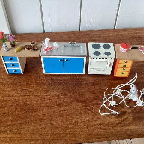 Div Lundby dockhusmöbler, köksmöbler, våningssäng, sminkbord med retro pallar, piano